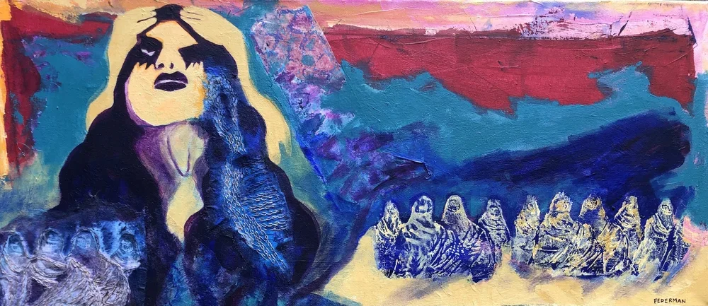 En la serie Mujeres (Mother Earth), Felisa Federman construye una cartografía visual donde identidad, territorio y desplazamiento se entrelazan en composiciones estratificadas que oscilan entre lo figurativo y lo casi abstracto. La figura femenina aparece como símbolo de humanidad — no como retrato individual, sino como arquetipo colectivo — un cuerpo que encarna memoria histórica y pertenencia cultural.