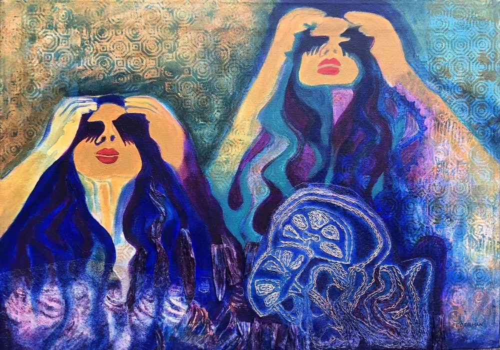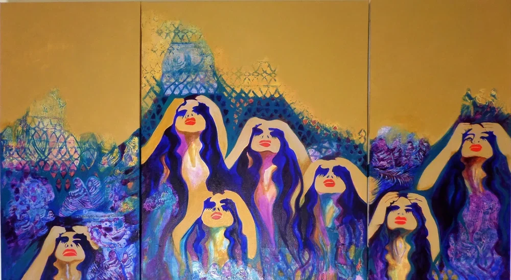 Sisters 3 panels. Mixed media on canvas