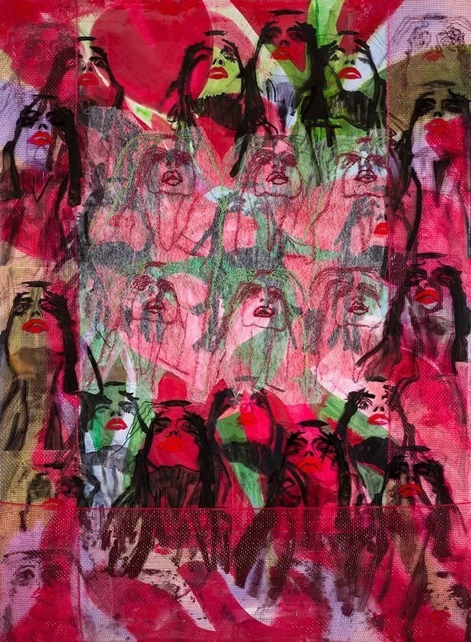 El pilar conceptual de esta serie es la leyenda de Anahí, la joven guaraní que, tras defender su territorio, se transmuta en la flor del ceibo al ser consumida por el fuego. Esta metamorfosis —de la hoguera a la flor roja — ese intenso color simboliza pasión y fuerza de la naturaleza que no puede ser erradicada. En mis piezas, la cara de la mujer se entrelaza con formas que sugieren cabelleras o carpas, generando imágenes de albergue y protección frente a las adversidades del entorno.